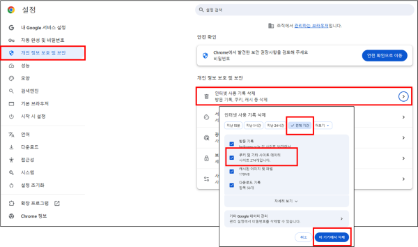 가. 크롬(Chrome) 브라우저 사용 시 크롬창 상단 우측 점 3개 눌러 설정 > 개인정보 보호 및 보안 > 인터넷 사용기록 삭제 > 기간 : 전체기간 > 쿠키 체크 후 삭제 버튼